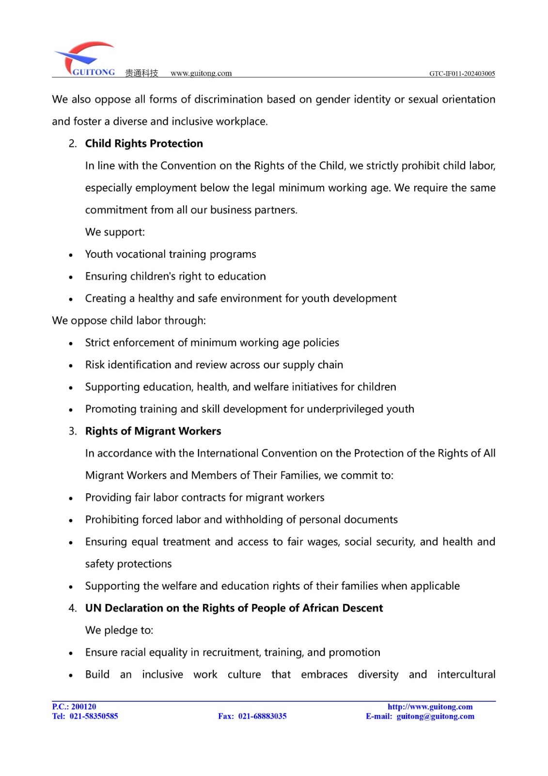 Our company is committed to respecting and protecting the human rights of all employees, customers, and partners. We comply with all relevant laws and regulations, oppose all forms of discrimination and exploitation, and promote a fair, respectful, and inclusive working environment.